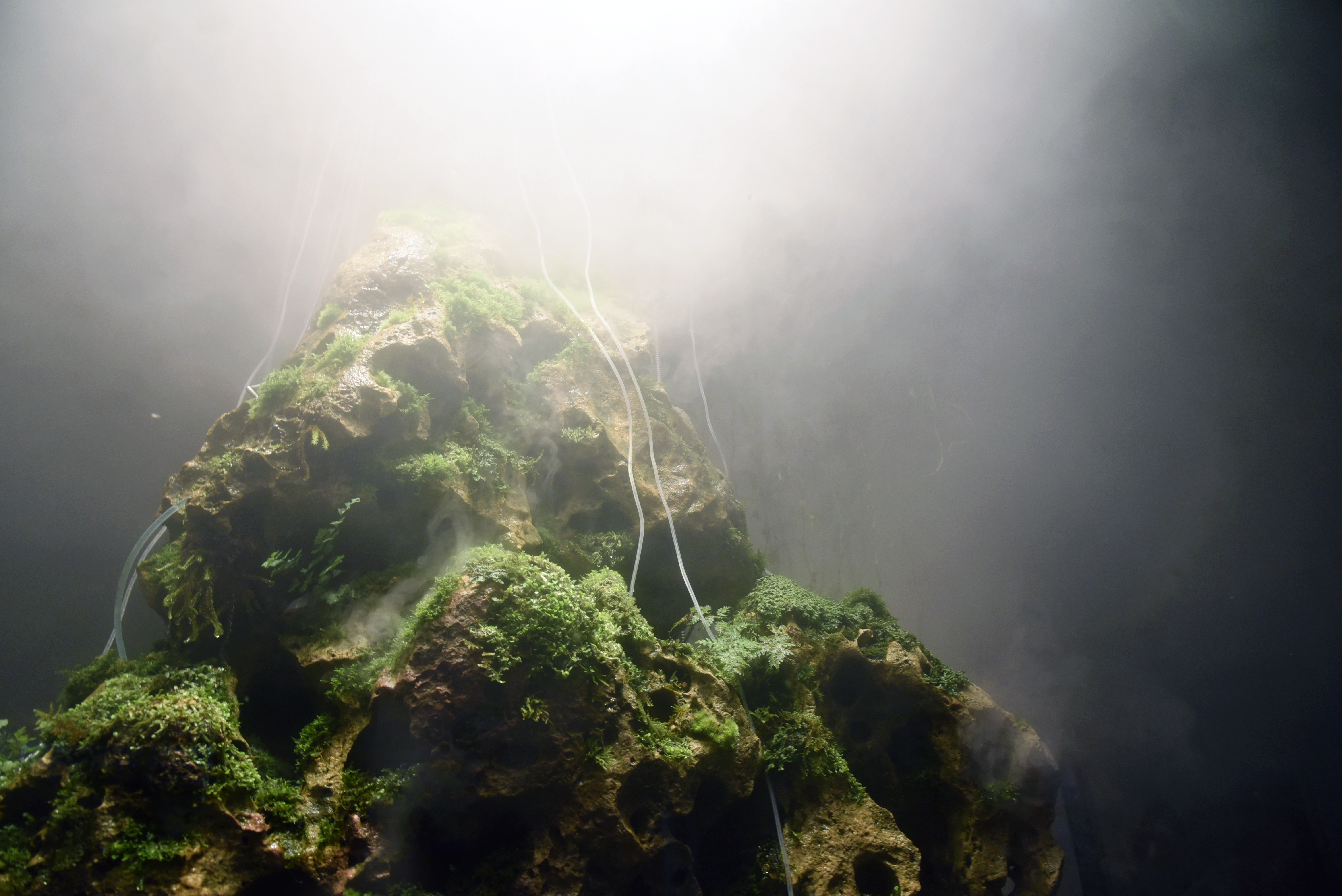 In 2020, Cradle was first showcase at Project Fulfill Art space. In this version, a large indoor ecosystem was constructed within a mechanical cradle, featuring a hanging display of unique Taiwanese moss species using several tons of rocks. Moss, which requires abundant humidity, appeared in the early stages of plant evolution. By detecting the biological signals of the moss, the hybrid installation actively utilized a mist generator to release moisture into the air, regulating the environmental humidity and transforming the human-inhabited space into a suitable habitat for the moss.